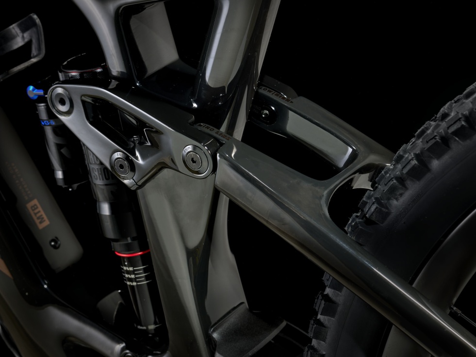 Rám Karbon OCLV pro horská kola, vyjímatelná baterie, vnitřní vedení lanek, slitinový kolébkový spoj, 34,9mm sedlová trubka, úchyt na horní vodítko řetězu, 55mm řetězová linka, Mino Link, ABP, Boost148, UDH, zdvih 140 mm.