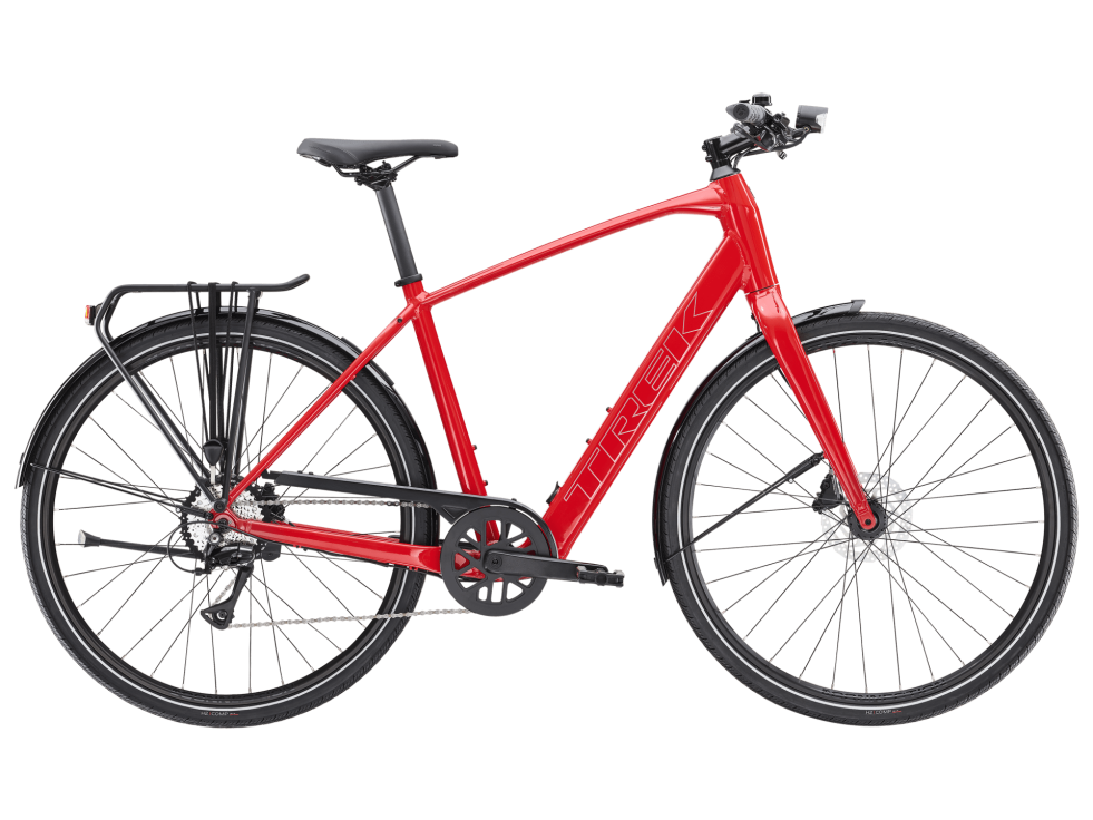Lehký hliníkový rám a vidlice, patentovaný systém podpory šlapání Trek od značky Hyena s motorem v náboji (250 W, 40 Nm), který poskytuje podporu až do rychlosti 25 km/h, a 250Wh baterie pro dojezd až 55 kilometrů na jedno nabití. Navíc rychlá kola 700c, rychlé a přitom stabilní pláště 40c s reflexními bočnicemi, spolehlivý 8rychlostní pohon Shimano, hydraulické kotoučové brzdy, integrovaná světla napájená z baterie, zadní nosič kompatibilní se systémem MIK, blatníky a stojánek.