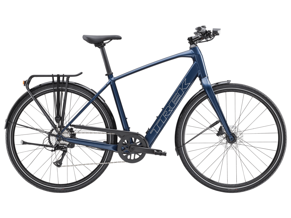 Lehký hliníkový rám a vidlice, patentovaný systém podpory šlapání Trek od značky Hyena s motorem v náboji (250 W, 40 Nm), který poskytuje podporu až do rychlosti 25 km/h, a 250Wh baterie pro dojezd až 55 kilometrů na jedno nabití. Navíc rychlá kola 700c, rychlé a přitom stabilní pláště 40c s reflexními bočnicemi, spolehlivý 8rychlostní pohon Shimano, hydraulické kotoučové brzdy, integrovaná světla napájená z baterie, zadní nosič kompatibilní se systémem MIK, blatníky a stojánek.