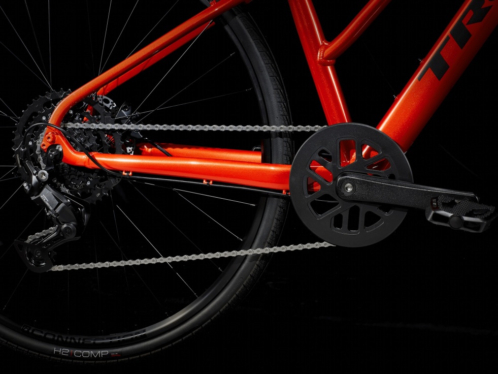 Lehký hliníkový rám se sníženou horní trubkou pro snadnější nasedání i sesedání, hydraulické kotoučové brzdy s brzdným účinkem za každého počasí, pohon Shimano s 9 rychlostmi a široký rozsah převodů, který zajišťuje, že nikdy nebudete muset šlapat příliš namáhavě či příliš snadno, a úchyty, které usnadní připevnění příslušenství na kolo.