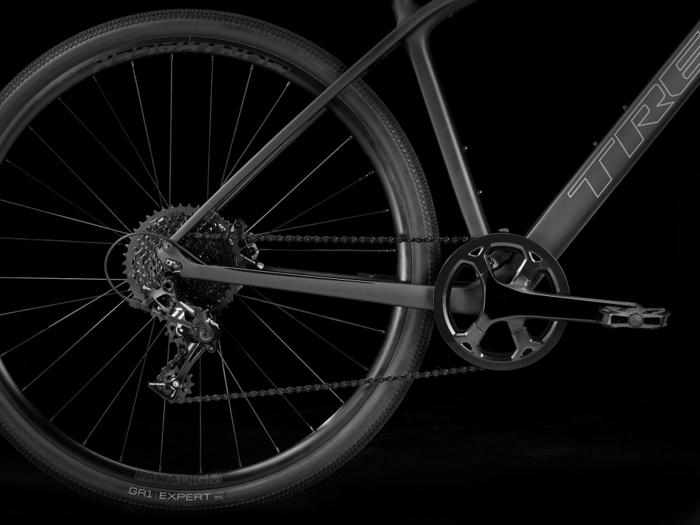 Lehký rám a vidlice z karbonu OCLV řady 400, pohon 1x SRAM Apex se širokým rozsahem převodů, hydraulické kotoučové brzdy, skryté úchyty na blatníky, lehká sada slitinových kol Bontrager Paradigm umožňující použití bezdušových plášťů, široké a rychlé gravelové pláště Bontrager GR1 Expert a řídítka s ergonomickými gripy tlumící vibrace.