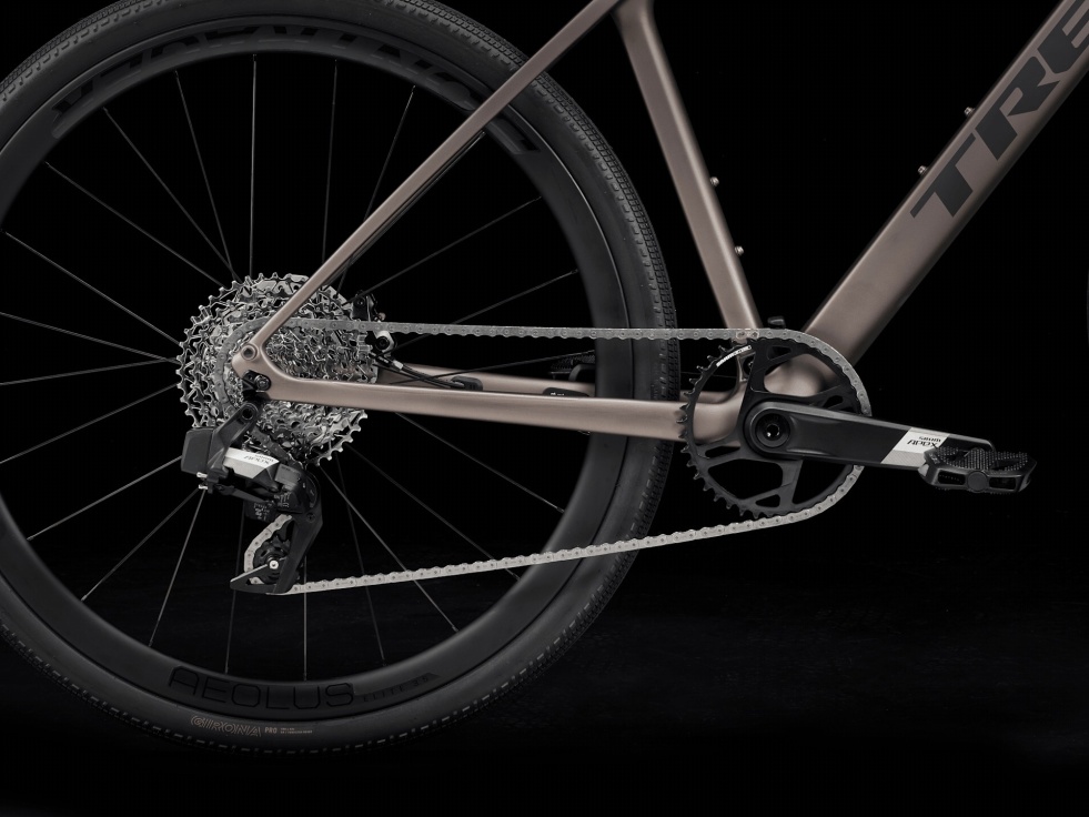 Lehký rám z karbonu OCLV řady 400 s karbonovou vidlicí, 12rychlostní bezdrátový elektronický pohon SRAM Apex XPLR AXS se širokým rozsahem převodů, hydraulické kotoučové brzdy, skryté úchyty na blatníky, lehká karbonová kola Bontrager Aeolus Elite 35 se špičkovými gravelovými plášti Bontrager GR1 Team Issue připravenými na bezdušovou verzi a řídítka s ergonomickými gripy tlumící vibrace.