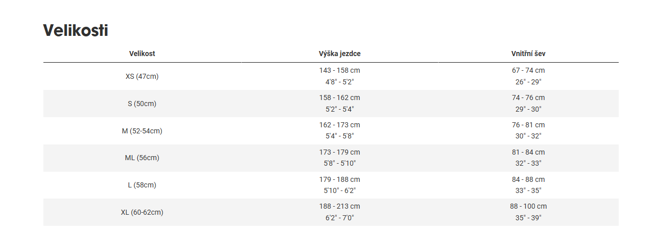 Stem : Velikost: XS Trek RCS Pro, –7 stupňů, délka 80 mm. / Velikost: S, M Trek RCS Pro, –7 stupňů, délka 90 mm. / Velikost: L, ML Trek RCS Pro, –7 stupňů, délka 100 mm. / Velikost: XL Trek RCS Pro, –7 stupňů, délka 110 mm.
