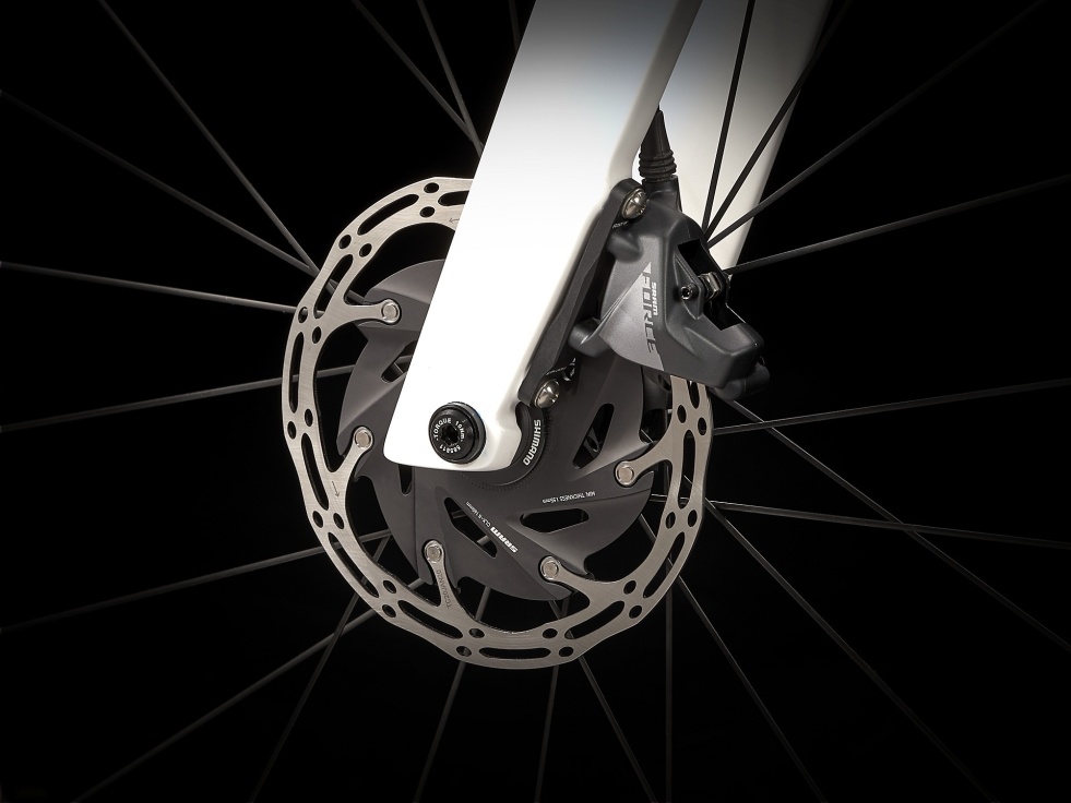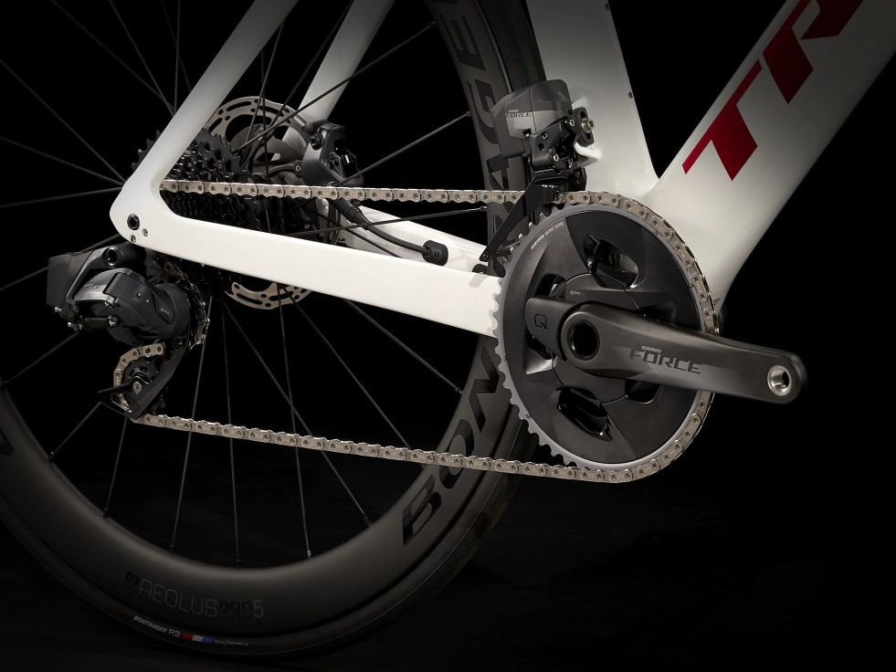 Rám z materiálu OCLV Carbon řady 500, vidlici s profilem Kammtail Virtual Foil, která si hravě poradí s větrem, a tlumicí prvek IsoSpeed vyhlazující nerovnosti. Bezdrátové elektronické řazení SRAM Force eTap AXS 2x12, hydraulické kotoučové brzdy, wattmetr SRAM Force AXS a sadu kol Bontrager Aeolus Pro 5 z materiálu OCLV Carbon připravenou na bezdušový systém.