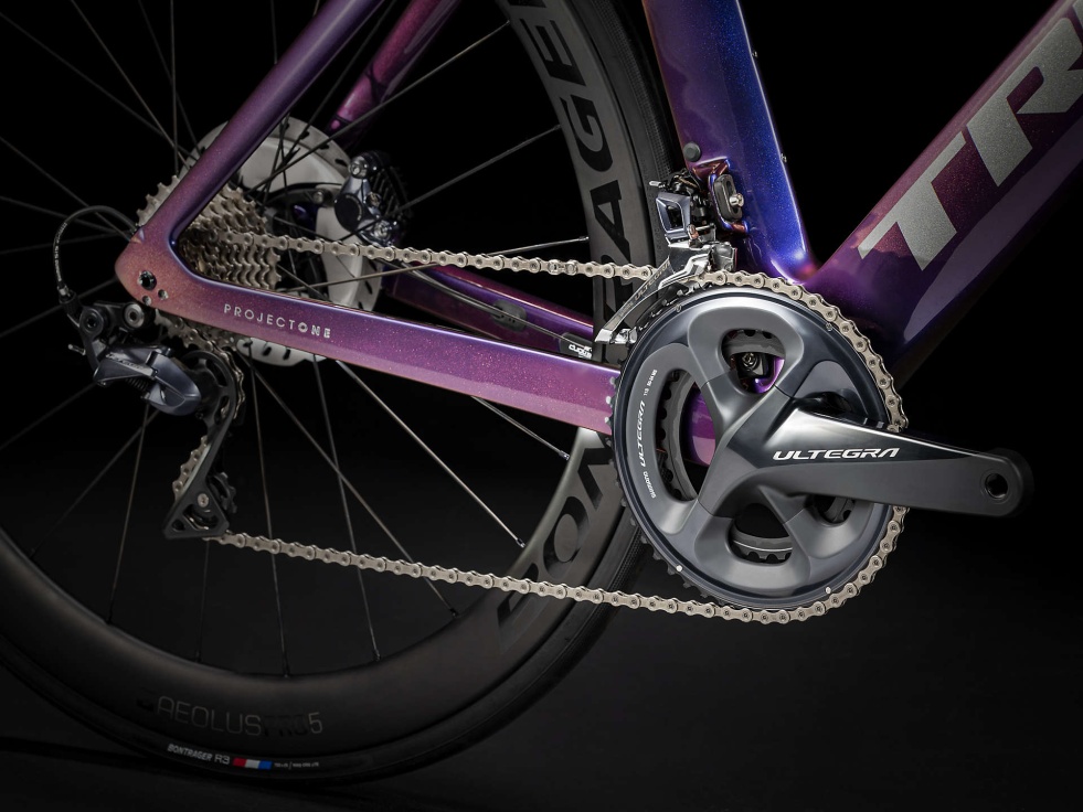 Lehký karbonový rám OCLV řady 700 s aerodynamickým profilem trubek Kammtail Virtual Foil a odpružením IsoSpeed na horní trubce tlumícím vibrace, celokarbonová vidlice KVF pro kotoučové brzdy, nastavitelná aerodynamická řídítka a představec, pohon 2x11 Shimano Ultegra, kola Bontrager Aeolus Pro 5 Disc umožňující použití bezdušových plášťů, mikronastavitelný sedlový nástavec Madone a hydraulické kotoučové brzdy Shimano Ultegra s úchytem Flat Mount.