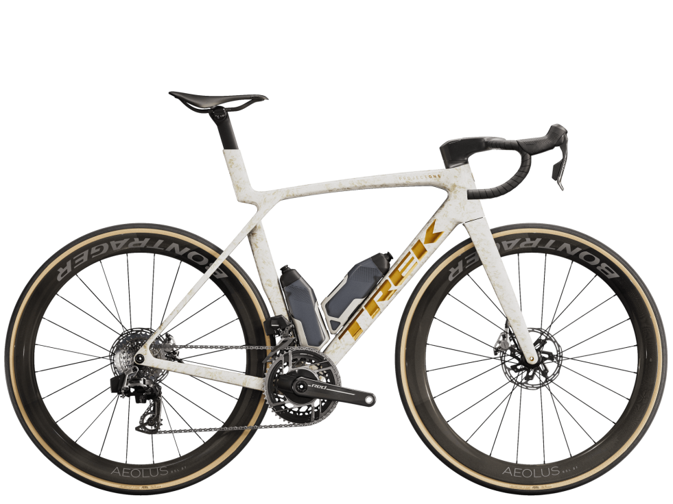 Neuvěřitelně lehký rám z našeho nejlepšího karbonu OCLV řady 900 s aerodynamicky tvarovanými trubkami, technologií IsoFlow zaručující pohodlí a aerodynamickými lahvemi a košíky RSL, které šetří watty. Lehoučký pohon SRAM RED AXS E1 a wattmetr pro trénink s datovým výstupem. Univerzální patka přehazovačky, takže lze náhradu sehnat kdekoli. Stroj doplňují bezdušová karbonová kola Bontrager Aeolus RSL 51 a jednodílná řídítka s představcem Trek Aero RSL.