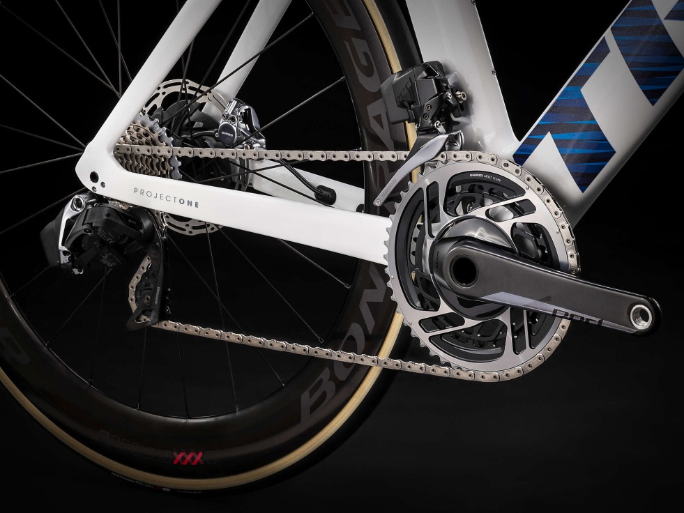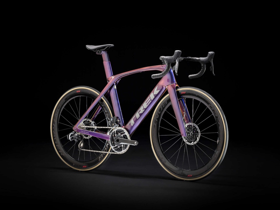 Lehký karbonový rám OCLV řady 700 s aerodynamickým profilem Kammtail Virtual Foil a prvkem IsoSpeed na horní trubce, který vyhlazuje nerovnosti silnice, celokarbonová vidlice KVF, nastavitelná aerodynamická řídítka a představec, bezdrátový elektronický pohon 2x12 SRAM RED eTap AXS, kola Bontrager Aeolus XXX 6 umožňující použití bezdušových plášťů, mikronastavitelný sedlový nástavec Madone a hydraulické kotoučové brzdy RED s úchytem Flat Mount.
