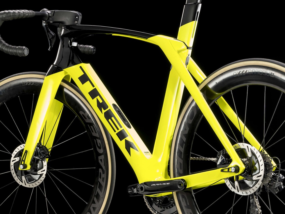 Lehký karbonový rám OCLV řady 700 s aerodynamickým profilem Kammtail Virtual Foil a odpružením IsoSpeed na horní trubce tlumícím vibrace, celokarbonová vidlice Madone KVF pro diskové brzdy, 12mm pevné osy, nastavitelná aerodynamická řídítka a představec, elektronické řazení 2×11 Shimano Dura-Ace Di2, kola Bontrager Aeolus XXX 6 umožňující použití bezdušových plášťů, mikronastavitelný sedlový nástavec Madone a diskové brzdy Dura-Ace s úchytem Flat Mount.