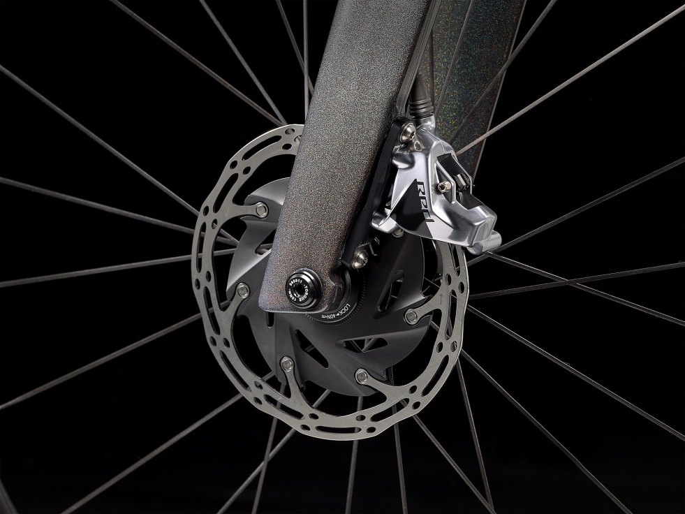 Vidlice Celokarbonová, Madone, KVF, kónický karbonový sloupek, skryté vedení lanek, kotouč s úchytem Flat Mount, karbonové patky, pevná osa 12 × 100 mm.