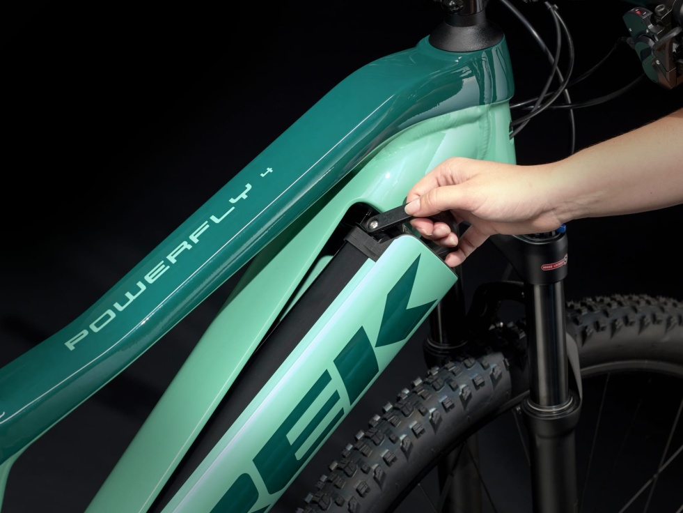 3. Systém vyjímatelné integrované baterie (RIB) Trek je elegantní a velmi praktický. Baterie je skrytá v rámu, který ji zároveň chrání. Snadno ji vyjmete bez nářadí a na dolní trubku můžete namontovat košík na lahev. Ano, i na celoodpružené horské elektrokolo!