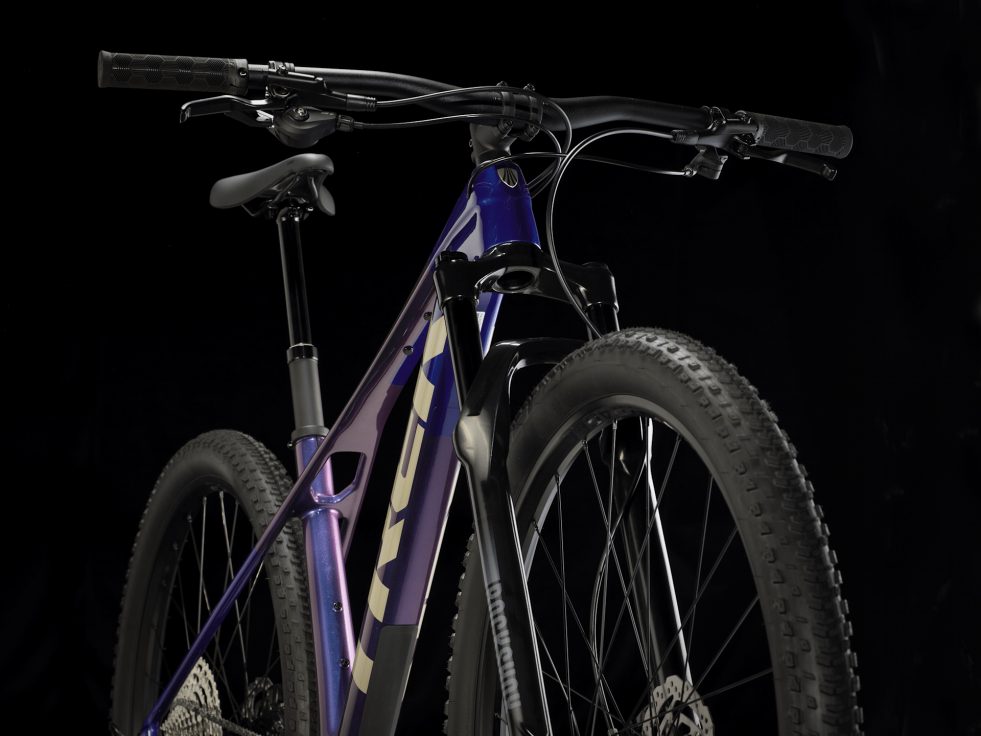 Karbonový rám OCLV Mountain s technologií IsoBow pro vyhlazování nerovností trailů. Vidlice RockShox Judy GOLD se 120mm zdvihem, pružina Solo Air a zamykání TurnKey. 12rychlostní řazení Shimano Deore s hydraulickými brzdami, teleskopická sedlovka Bontrager a bezdušová 29palcová kola.