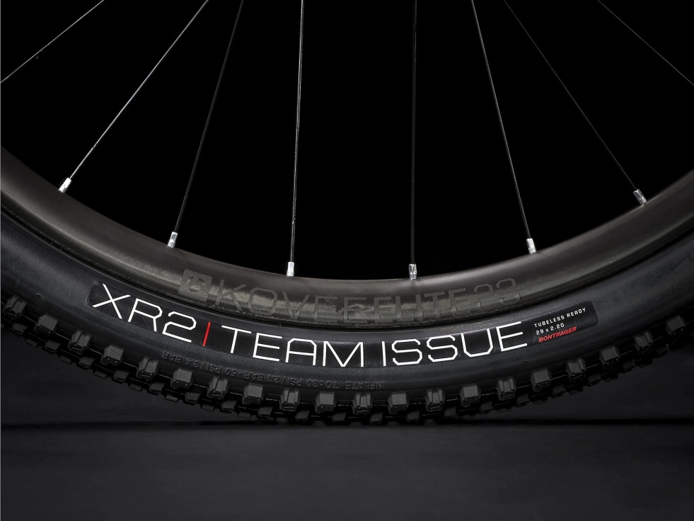 Pláště : Bontrager XR2 Team Issue umožňující použití bezdušového kitu, 120 tpi, aramidová ochrana, 29×2,20 palců (13,5 a 15,5: 27,5×2,20 palců).