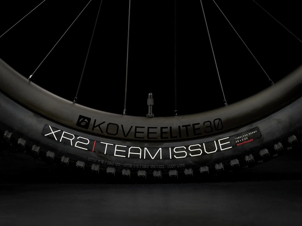 | Zadní kolo | Bontrager Kovee Elite 30, karbon OCLV pro horská kola, možnost použití bezdušových plášťů, Rapid Drive 54, Microspline, 6 šroubů, Boost148, 12mm pevná osa |