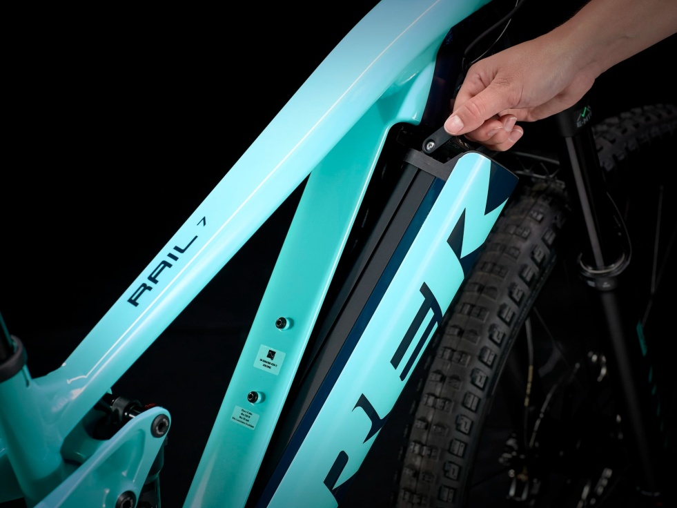 5. Systém vyjímatelné integrované baterie (RIB) Trek je elegantní a praktický. Baterie se ukrývá v rámu, který ji zároveň chrání. Snadno ji vyjmete bez nářadí a na dolní trubku můžete namontovat košík na lahev.