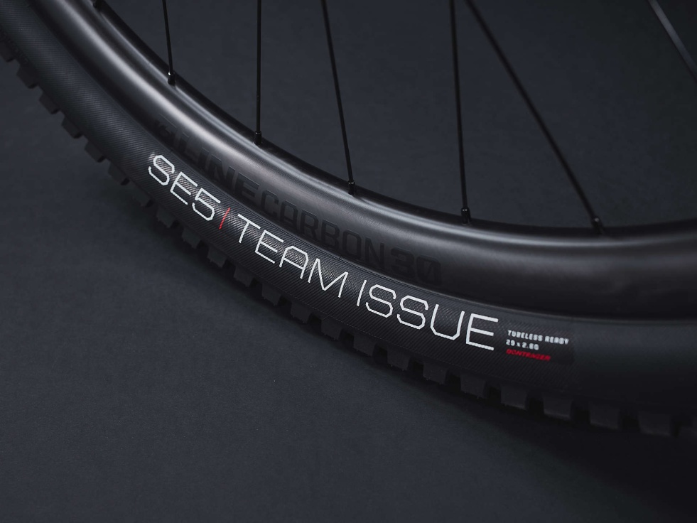 | Pláště | Bontrager SE5 Team Issue, umožňující použití bezdušových plášťů, bočnice Core Strength, aramidová patka, 60 tpi, 29 × 2,60 palce. |