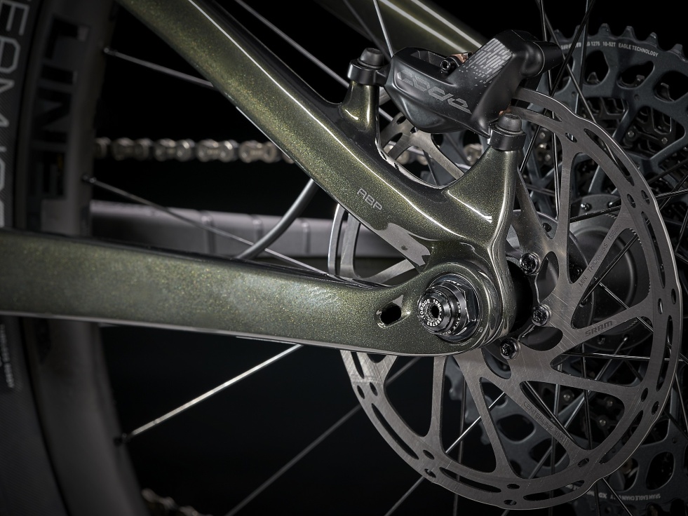 Celokarbonový rám z materiálu OCLV Mountain Carbon, 160mm vidlici FOX Performance 38 Float s tlumičem GRIP2, zadní tlumič FOX DPX2 se zdvihem 150mm a širokými možnostmi doladění. Dál ještě sadu SRAM GX Eagle 1x12 s lehčími převody do stoupání, díky nimž ušetříte energii, kola Bontrager Line Carbon 30 a 54zubý zadní náboj Rapid Drive s rychlou aktivací, karbonová řídítka a teleskopickou sedlovku Bontrager Line Elite.