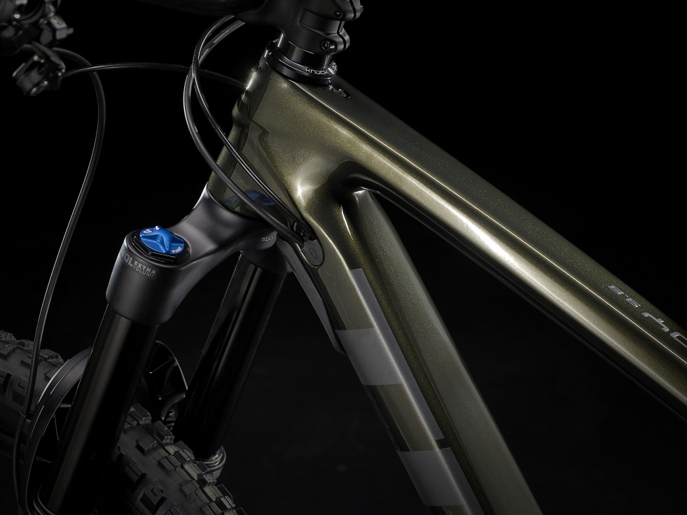 Celokarbonový rám z materiálu OCLV Mountain Carbon, 160mm vidlici FOX Performance 38 Float s tlumičem GRIP2, zadní tlumič FOX DPX2 se zdvihem 150mm a širokými možnostmi doladění. Dál ještě sadu SRAM GX Eagle 1x12 s lehčími převody do stoupání, díky nimž ušetříte energii, kola Bontrager Line Carbon 30 a 54zubý zadní náboj Rapid Drive s rychlou aktivací, karbonová řídítka a teleskopickou sedlovku Bontrager Line Elite.