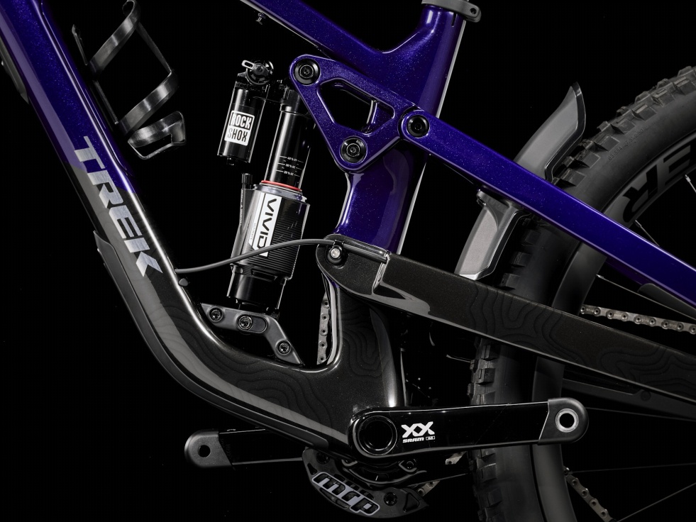 Odpružený rám z karbonu OCLV pro horská kola s vysoko umístěným čepem a vnitřním úložným prostorem. 170mm zdvih vpředu i vzadu, vidlice RockShox ZEB Ultimate s pružinou DebonAir a tlumením Charger 3.1 RC2 a tlumič RockShox Vivid Ultimate. Převodovka SRAM XX Eagle AXS zajišťuje bezdrátové řazení, které je přesné i pod zatížením. Teleskopická sedlovka Bontrager Line zas poskytuje dostatek místa k pohybu na kole. 29palcové přední a 27,5palcové zadní karbonové kolo Bontrager Line Pro 30 umožňující použití bezdušových plášťů s náboji Rapid Drive hravě zvládnou jakýkoli povrch.
