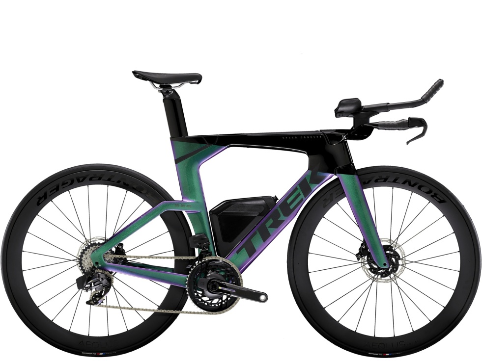 Lehoučký rám z karbonu OCLV řady 800, aerodynamický profil trubek Kammtail Virtual Foil (KVF) snižující odpor vzduchu, celokarbonová vidlice Speed Concept, nerovnosti tlumící prvek IsoSpeed, integrovaný úložný prostor na výživu, hydrataci a sadu na opravdu defektu, 12rychlostní bezdrátový elektronický pohon SRAM Force AXS D2 s řazením SRAM AXS Clics, wattmetr Force AXS, plně integrovaná řídítka a představec, sedlo Bontrager Hilo Comp určené na triatlon s agresivní aerodynamickou pozicí, spolehlivé kotoučové brzdy a kola Bontrager Aeolus Pro 51 z karbonu OCLV.