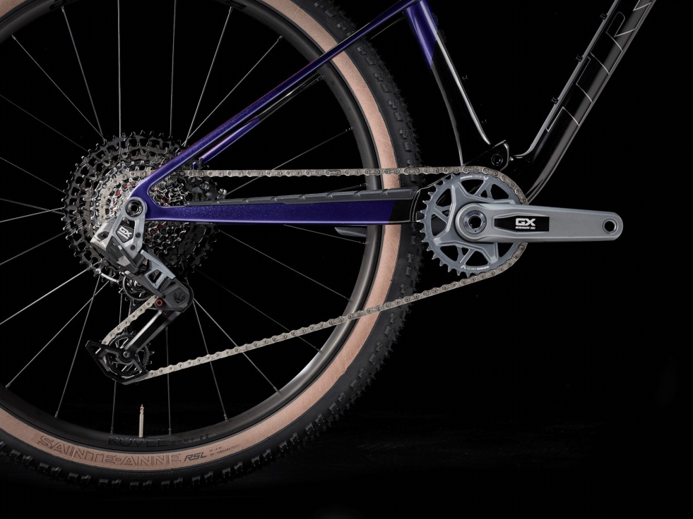 Lehoučký rám SLRz karbonu HM OCLV pro horská kola s moderní XC geometrií. 110mm přední odpružení díky vidlici RockShox SID s pružinou DebonAir a tlumičem Rush RL a zadní 80mm odpružení IsoStrut tlumiče RockShox SIDLuxe, vše se vzdáleným zamykáním. Zcela bezdrátové 12rychlostní elektronické řazení SRAM GX AXS, kola Bontrager Kovee Comp 30 a karbonová řídítka Bontrager Line Pro, teleskopická sedlovka Bontrager Line a čtyřpístkové hydraulické kotoučové brzdy SRAM Level Bronze.