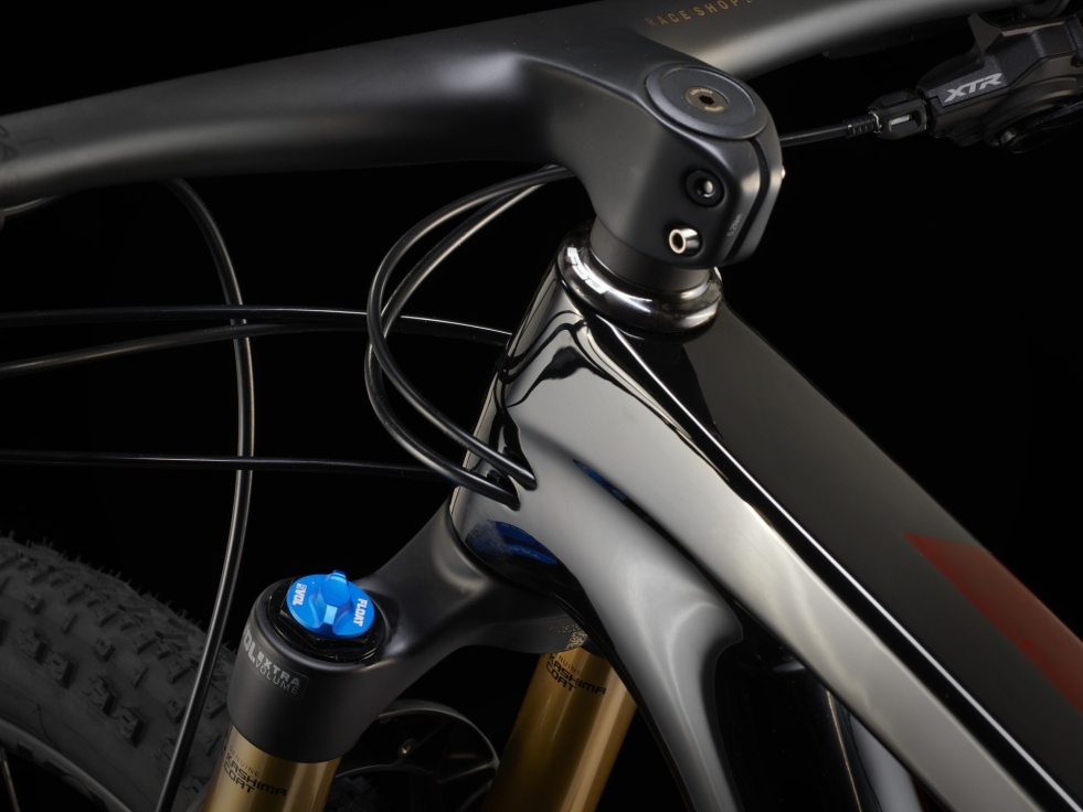 Lehoučký rám SLR z karbonu HM OCLV pro horská kola s moderní XC geometrií. 110mm přední odpružení díky vidlici Fox Performance 34 step-cast se vzduchovou pružinou Float EVOL, tlumič GRIP 2 s dvojím vzdáleným zamykáním a zadní 80mm odpružení IsoStrut tlumiče RockShox SIDLuxe. Zcela bezdrátová 12rychlostní elektronická převodovka SRAM X0 AXS, karbonová kola Bontrager Kovee Elite 23, kombinace řídítek a představce Bontrager RSL z karbonu, teleskopická sedlovka Bontrager Line a čtyřpístkové hydraulické kotoučové brzdy SRAM Level Bronze.