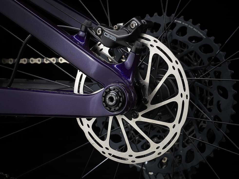 Lehký a tuhý celokarbonový rám, 120mm vidlice RockShox SID Select+, 120mm zadní zdvih s tlumičem SID Luxe a pohon SRAM GX Eagle s lehčím převodem do stoupání (52 zubů). Pak ještě široká karbonová kola Bontrager Line Elite 30 se 108zubým nábojem Rapid Drive pro okamžitou aktivaci, teleskopická sedlovka Bontrager Line Elite a karbonová řídítka.