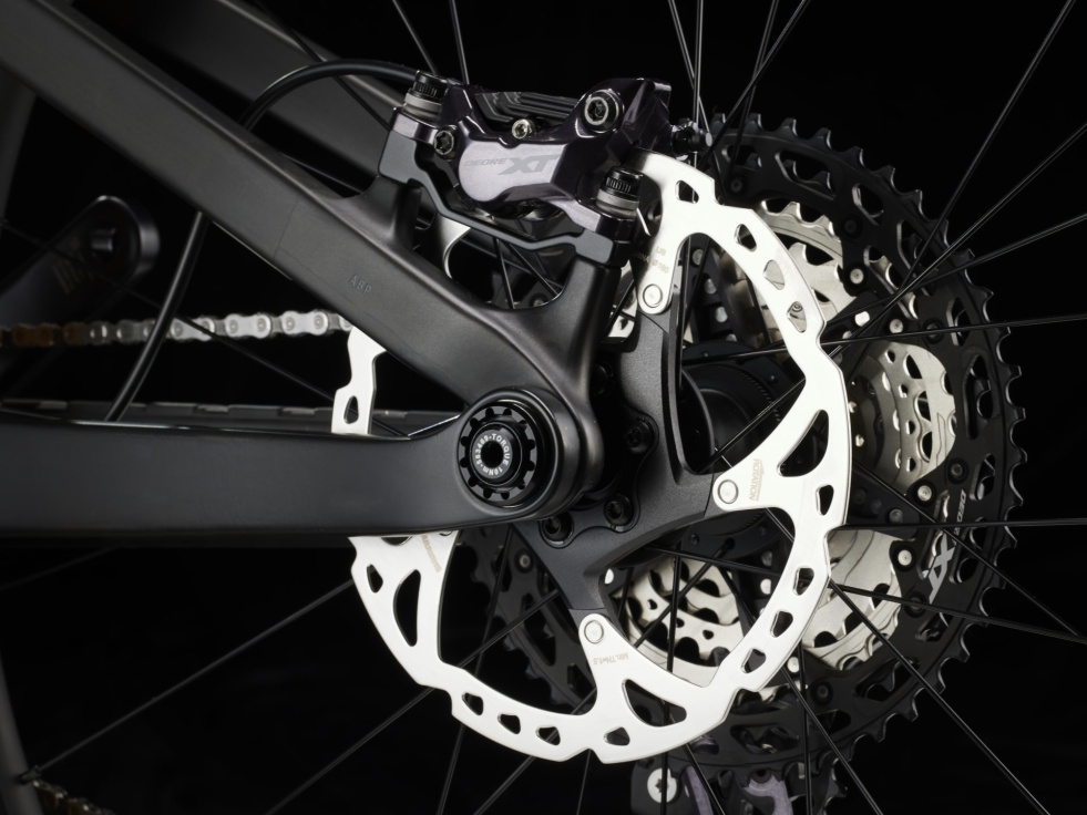 Lehký a tuhý celokarbonový rám, 130mm vidlice RockShox Pike Select+, zadní tlumič RockShox Deluxe Ultimate RCT se zdvihem 120 mm a nový pohon Shimano XT 1x12. Pak ještě široká karbonová kola Bontrager Line Elite 30 se 108zubým nábojem Rapid Drive pro okamžitou aktivaci, 4pístkové brzdy pro jisté sjezdy, teleskopická sedlovka Bontrager Line Elite a karbonová řídítka.
