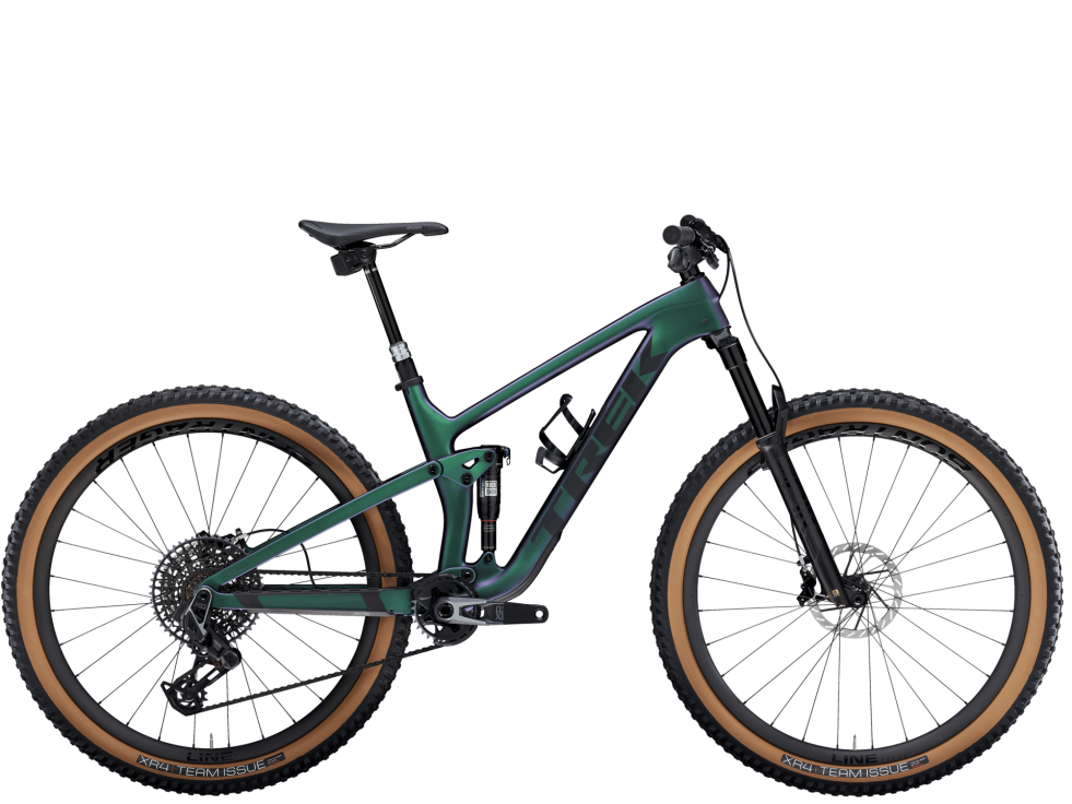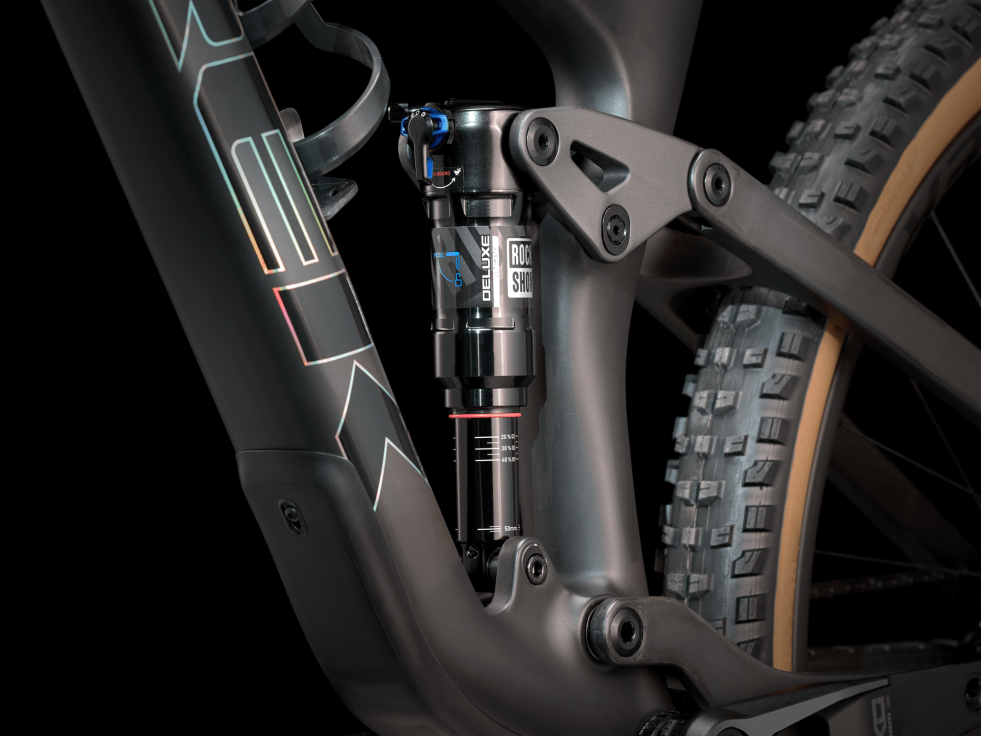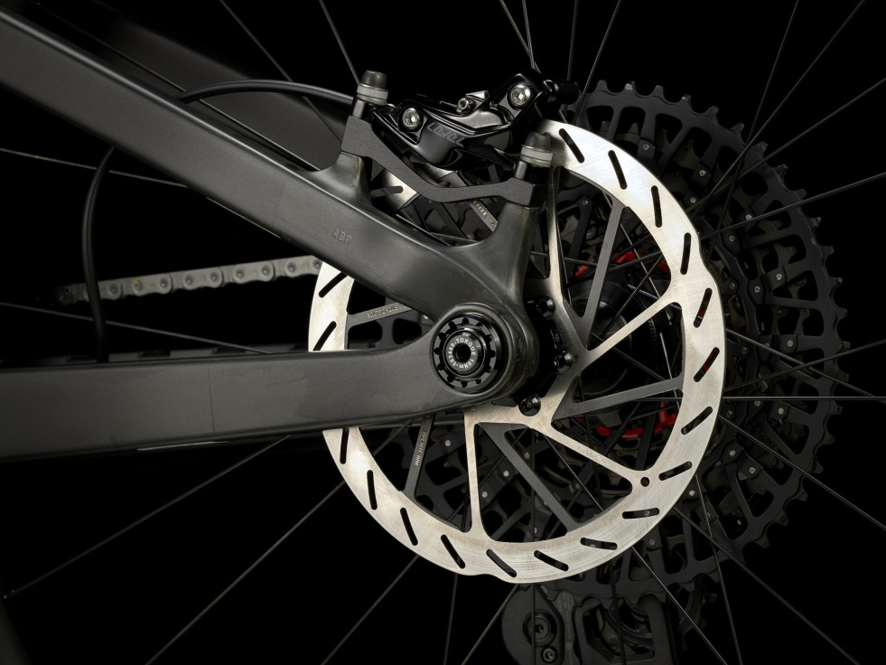 Lehký a tuhý rám z karbonu OCLV pro horská kola, 130mm vidlice RockShox Pike Ultimate s pružinou DebonAir a tlumení Charger 3 RC2, zadní tlumič RockShox Deluxe Ultimate RCT se zdvihem 120 mm a bezdrátová 12rychlostní sada SRAM X0 AXS pro přímou montáž, která je nejen odolná, ale i přesná. Pak ještě široká karbonová kola Bontrager Line Elite 30 se 108zubým nábojem Rapid Drive pro okamžitou aktivaci, čtyřpístkové brzdy pro jisté sjezdy, teleskopická sedlovka RockShox Reverb AXS a kombinace řídítek a představce z karbonu.