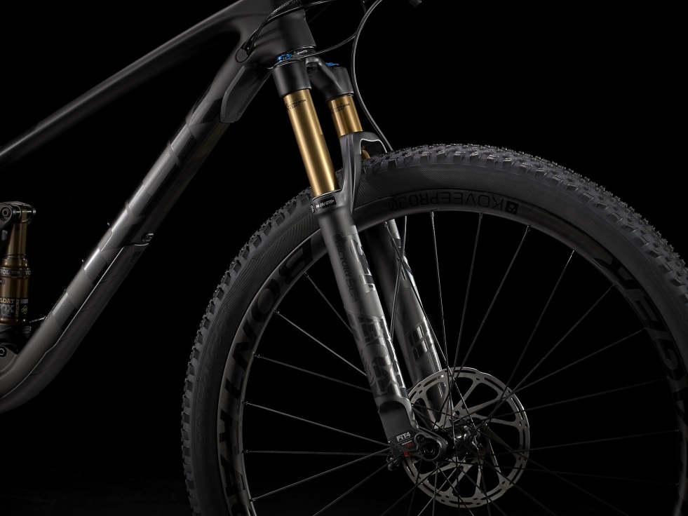 Lehký a tuhý celokarbonový rám, 120mm vidlici Fox Factory 34 Step-Cast, tlumič Fox Factory Float se zdvihem 115 mm a nové komponenty sady řazení SRAM X01 Eagle s extra lehkým převodem do stoupání (52 zubů). Dál ještě široká karbonová kola Bontrager Kovee Pro 30 se 108zubým nábojem Rapid Drive s okamžitou aktivací, zamykání předního i zadního odpružení z řídítek systémem Bontrager DropLock a spoustu karbonových dílů.
