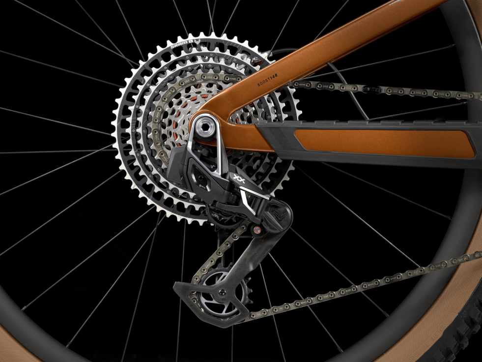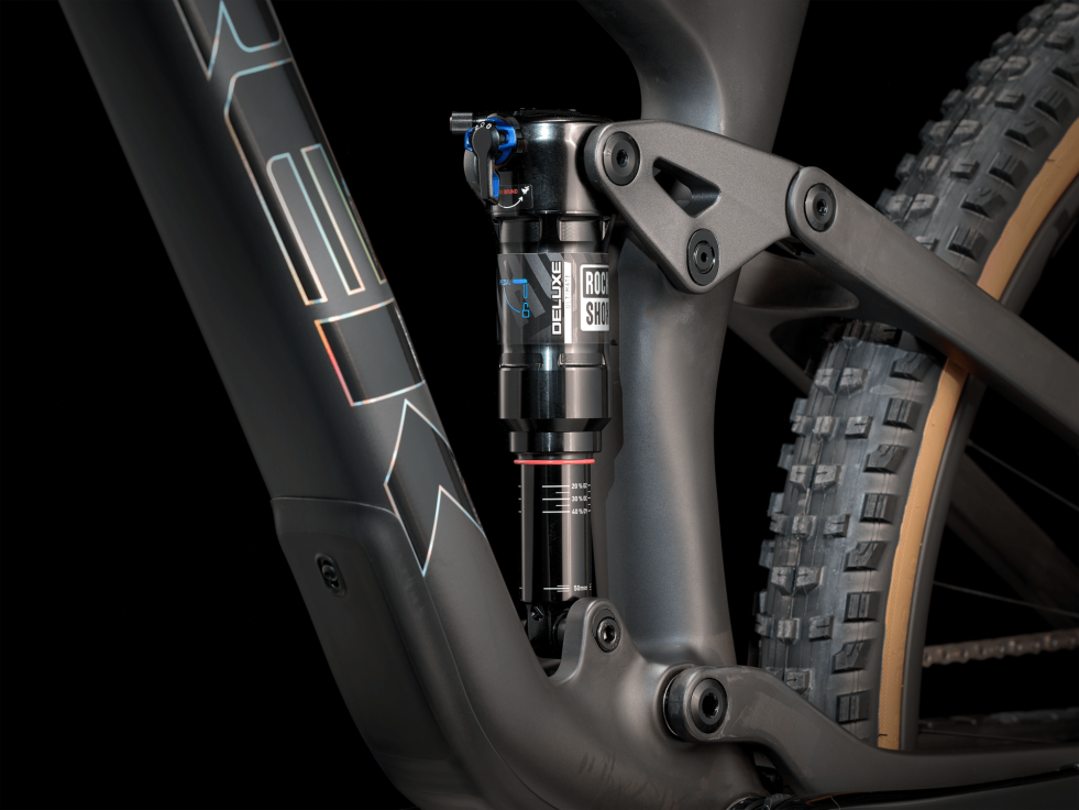 Lehký a tuhý rám z karbonu OCLV pro horská kola, 130mm vidlice RockShox Pike Ultimate s pružinou DebonAir a tlumení Charger 3 RC2, zadní tlumič RockShox Deluxe Ultimate RCT se zdvihem 120 mm a bezdrátová 12rychlostní sada SRAM XX AXS pro přímou montáž, která je nejen lehká, ale i přesná. Pak ještě široká karbonová kola Bontrager Line Elite 30 se 108zubým nábojem Rapid Drive pro okamžitou aktivaci, čtyřpístkové brzdy pro jisté sjezdy, teleskopická sedlovka RockShox Reverb AXS a kombinace řídítek a představce z karbonu.