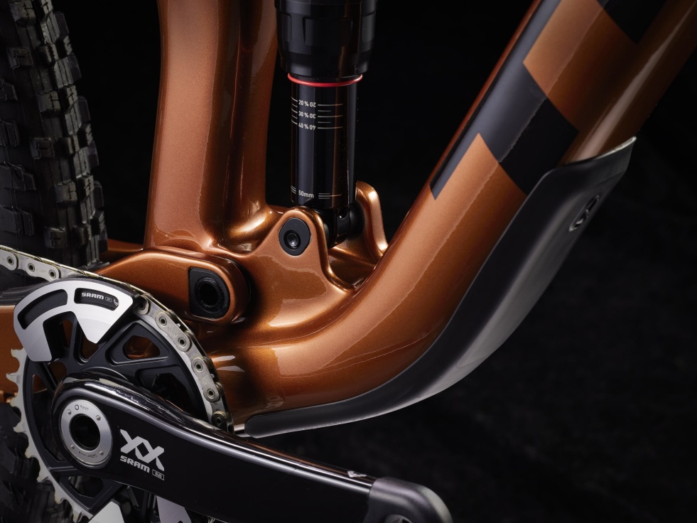 Lehký a tuhý rám z karbonu OCLV pro horská kola, 130mm vidlice RockShox Pike Ultimate s pružinou DebonAir a tlumení Charger 3 RC2, zadní tlumič RockShox Deluxe Ultimate RCT se zdvihem 120 mm a bezdrátová 12rychlostní sada SRAM XX AXS pro přímou montáž, která je nejen lehká, ale i přesná. Pak ještě široká karbonová kola Bontrager Line Elite 30 se 108zubým nábojem Rapid Drive pro okamžitou aktivaci, čtyřpístkové brzdy pro jisté sjezdy, teleskopická sedlovka RockShox Reverb AXS a kombinace řídítek a představce z karbonu.