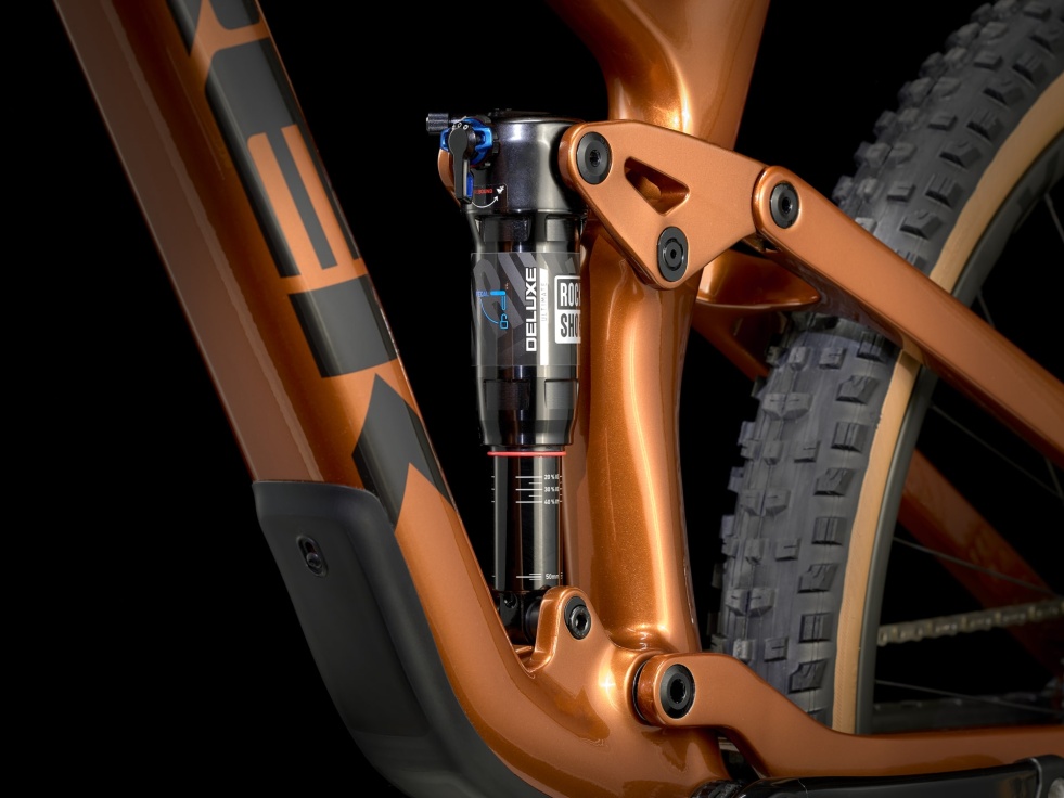 Lehký a tuhý rám z karbonu OCLV pro horská kola, 130mm vidlice RockShox Pike Ultimate s pružinou DebonAir a tlumení Charger 3 RC2, zadní tlumič RockShox Deluxe Ultimate RCT se zdvihem 120 mm a bezdrátová 12rychlostní sada SRAM XX AXS pro přímou montáž, která je nejen lehká, ale i přesná. Pak ještě široká karbonová kola Bontrager Line Elite 30 se 108zubým nábojem Rapid Drive pro okamžitou aktivaci, čtyřpístkové brzdy pro jisté sjezdy, teleskopická sedlovka RockShox Reverb AXS a kombinace řídítek a představce z karbonu.