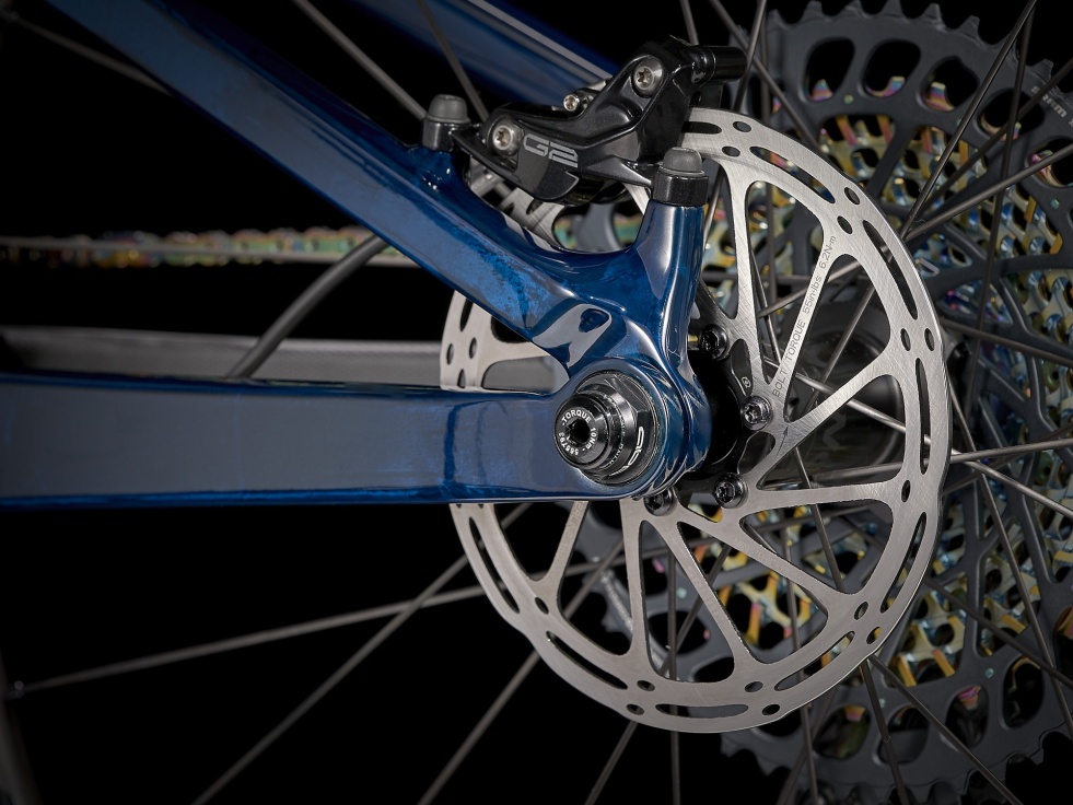Celokarbonový rám, úžasně citlivou 120mm vidlici RockShox Pike Ultimate s tlumičem Charger 2 RC2 a širšími možnostmi doladění, zadní tlumič RockShox Deluxe Ultimate se zdvihem 115 mm a bezdrátovou elektronickou sadu řazení SRAM XX1 Eagle AXS. Dál ještě široká karbonová kola Bontrager Kovee Pro 30 se 108zubým nábojem Rapid Drive s okamžitou aktivací, bezdrátovou teleskopickou sedlovku RockShox Reverb AXS a brzdy SRAM Level Ultimate s karbonovými páčkami.