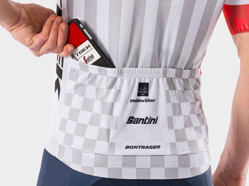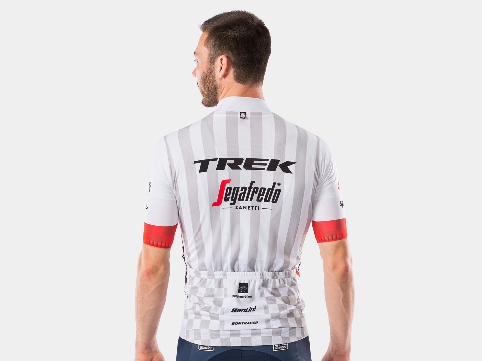 Oficiální týmové oblečení vyrábí Santini. Týmové logo Trek-Segafredo je na viditelném místě.