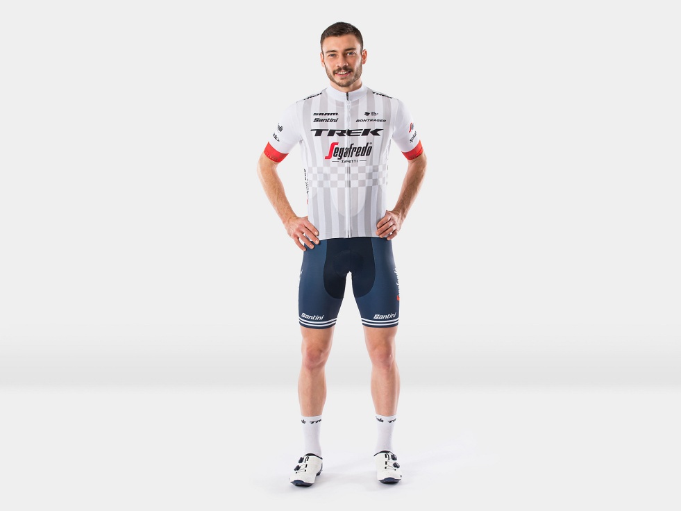 Oficiální týmové oblečení vyrábí Santini. Týmové logo Trek-Segafredo je na viditelném místě.